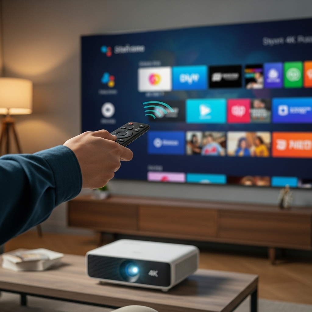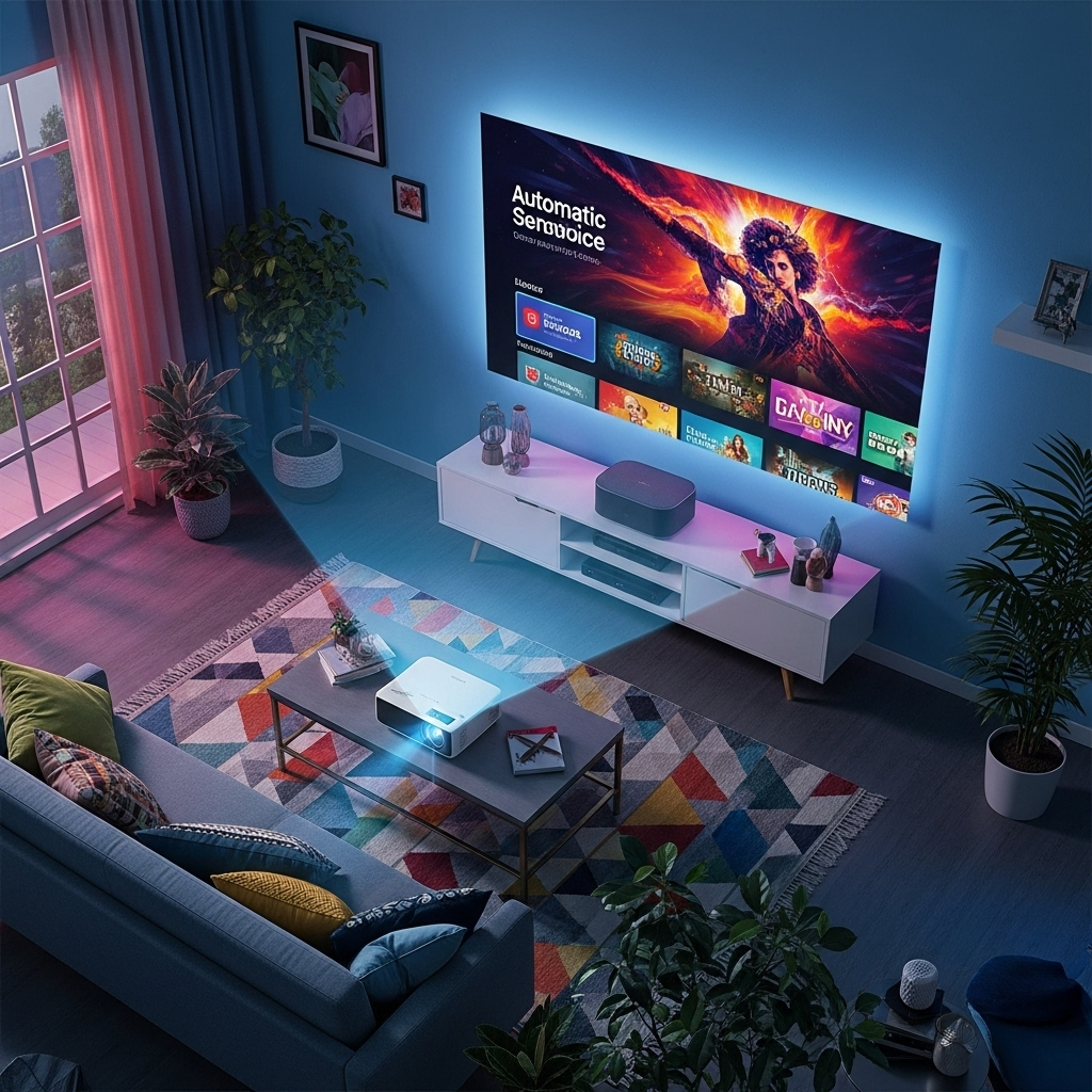 안드로이드 OS를 탑재하여 별도 기기 없이 OTT 서비스를 즐길 수 있습니다. 자동 키스톤 및 초점 기능으로 설치가 간편하며, 뛰어난 밝기로 거실 등 다양한 환경에서 활용하기 좋습니다.