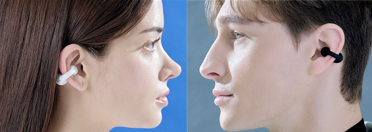 귀를 막지 않는 개방형 디자인으로 편안한 착용감. 소음 차단이 되지 않아 조용한 공간에서 사용하기 어려움