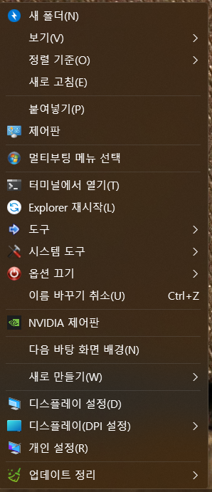1. 바탕화면 우클릭->제일 아래 "개인 설정" 을 클릭합니다.
