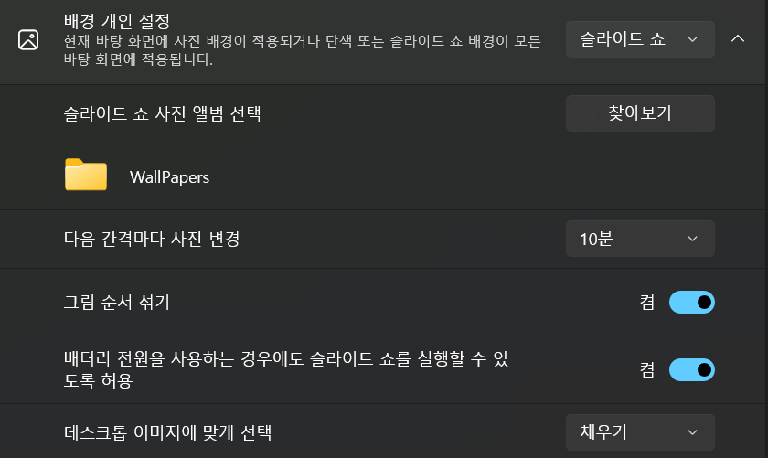 4. "배경 개인 설정" 에서 우측 화살표 아래로 클릭하여 "슬라이드 쇼" 클릭합니다.