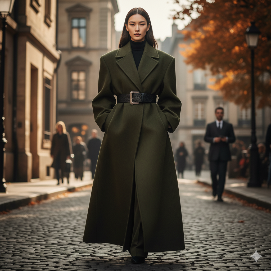 - ① 오버사이즈 숄더 & 테일러링 (The Power Shoulder): 80년대를 연상시키는 과장된 어깨 라인과 날카로운 테일러링이 돌아왔어요. 롱 코트에서는 특히 어깨 패드가 강조된 맥시(Maxi) 길이 코트가 인기를 끌 것으로 보입니다. 전체적으로 박시하지만 허리 라인을 벨트로 잡아주면 멋진 실루엣이 완성돼요.