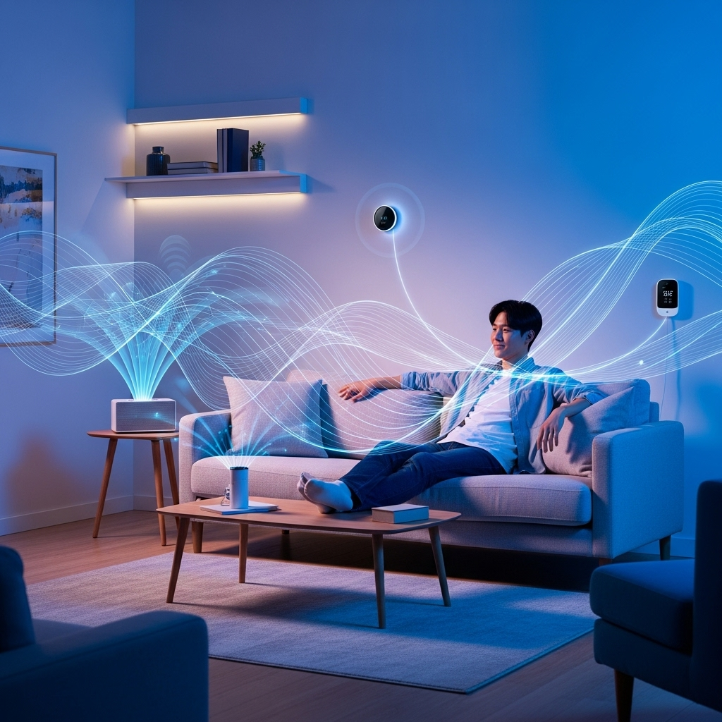 온도, 습도, 움직임, 소리, 빛 등 다양한 환경 정보를 감지하는 수많은 센서가 공간에 분산되어 실시간 데이터를 수집합니다. 이 데이터는 사용자의 활동 패턴과 환경 변화를 이해하는 데 활용됩니다.