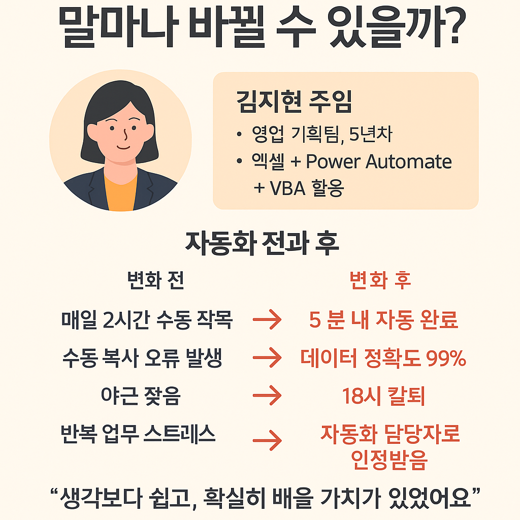 오늘은 실제 엑셀 자동화를 업무에 적용한 한 실무자의 이야기를 통해, 그 변화의 전후를 생생하게 들려드립니다.