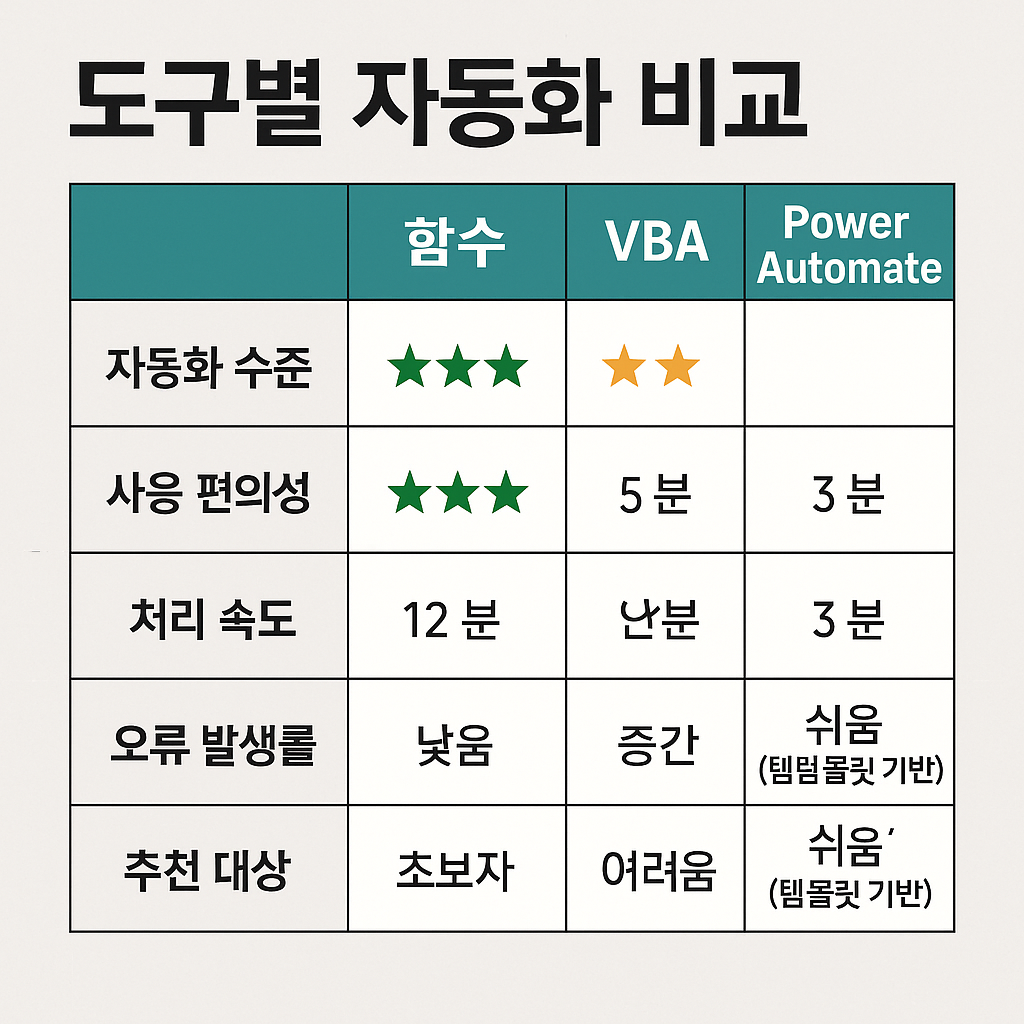 단순 작업은 함수, 반복은 VBA, 외부 공유는 Power Automate가 적합합니다.