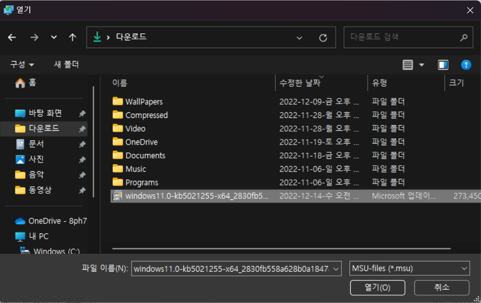 1) [Browse..] 버튼을 눌러서 파일종류 에서 cab 파일이나 msu 파일의 위치를 지정해줍니다.