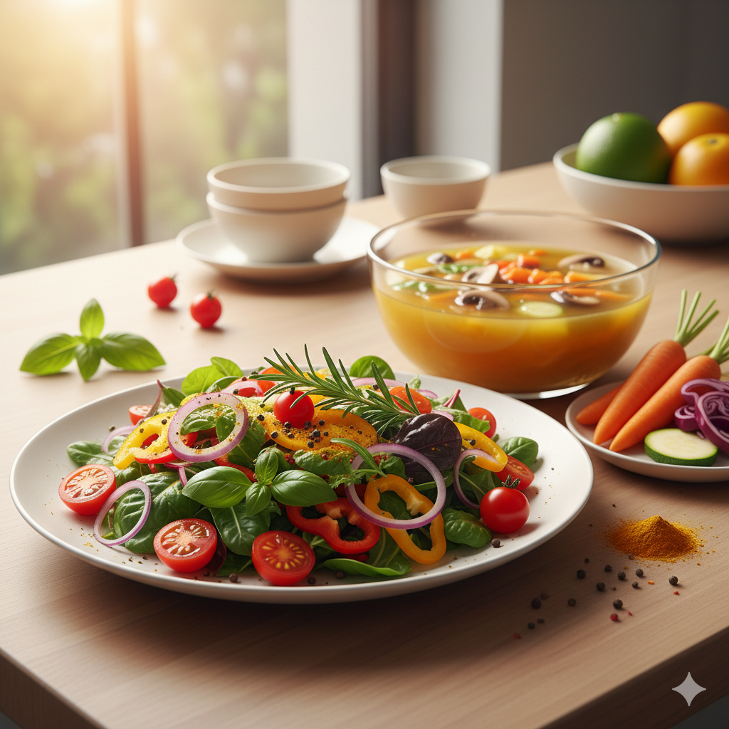 - 1. '소금' 대신 '풍미'로 채우기: 천연 육수, 신선한 허브(바질, 오레가노), 향신료(후추, 카레 가루)를 적극 활용하여 짠맛 대신 다양한 풍미를 즐기세요.