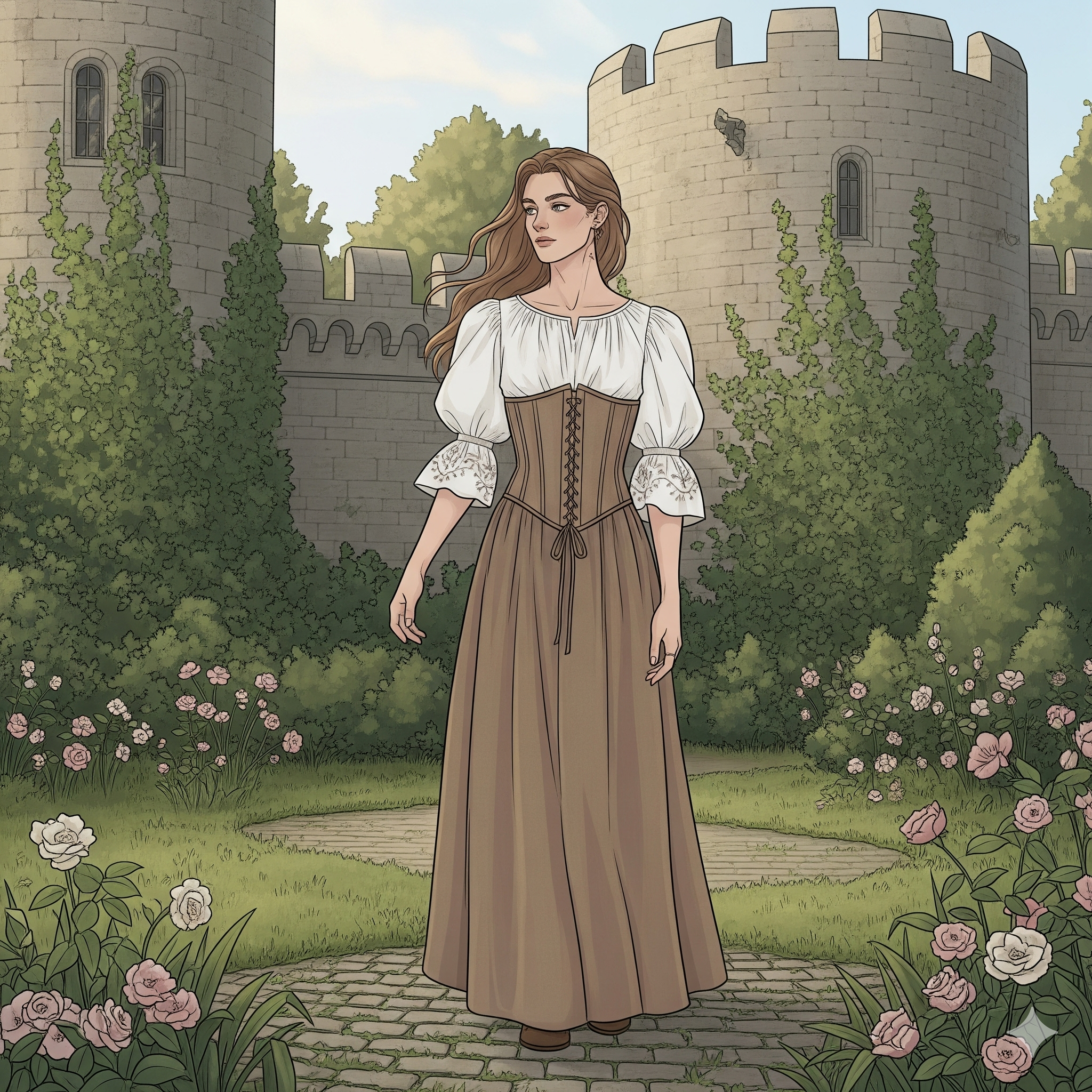 핵심 키워드: 퍼프 슬리브, 코르셋, 레이스, 리본, 자연스러운 톤, 플레어 스커트, 질감이 느껴지는 소재(린넨, 코튼 등)