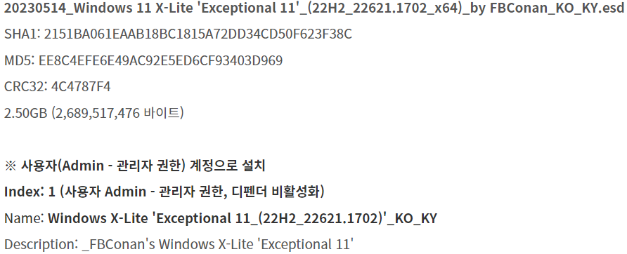 [펌]FBConan님 Windows 11 X-Lite Exceptional 11 (Windows 11 22H2_22621.1702) 버전의 지역화 버전 기반 VHD/WIM/ISO 3종