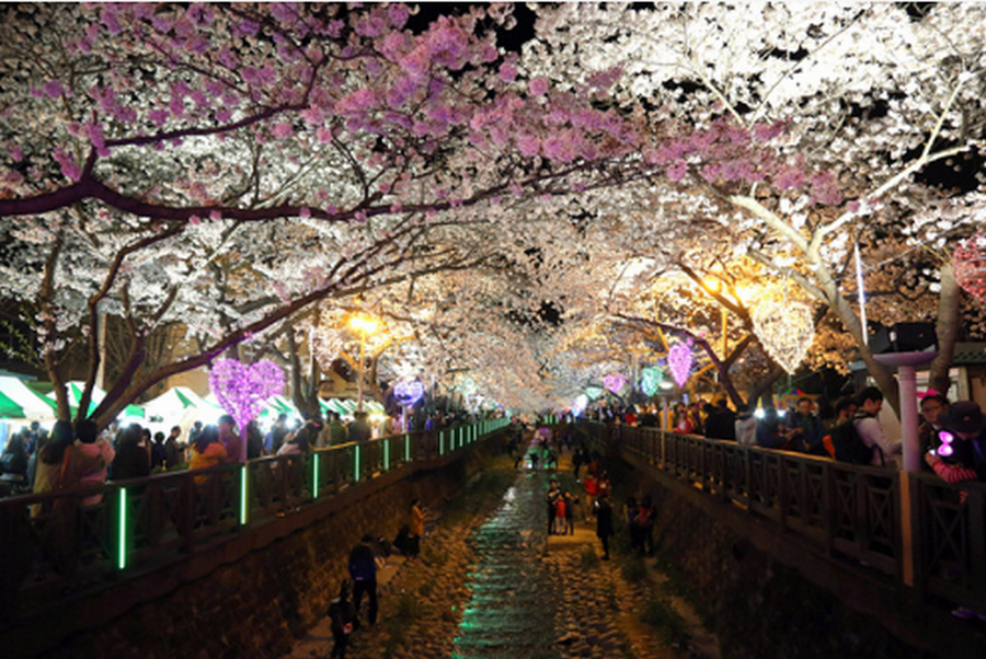 진해군항제의 중심지인 여좌천은 매년 수많은 인파가 몰리는 벚꽃의 성지입니다. 벚꽃 터널을 이루는 다리 주변 풍경은 그야말로 영화 속 한 장면 같고, 밤에는 라이트업으로 더욱 로맨틱한 분위기를 자아냅니다.
