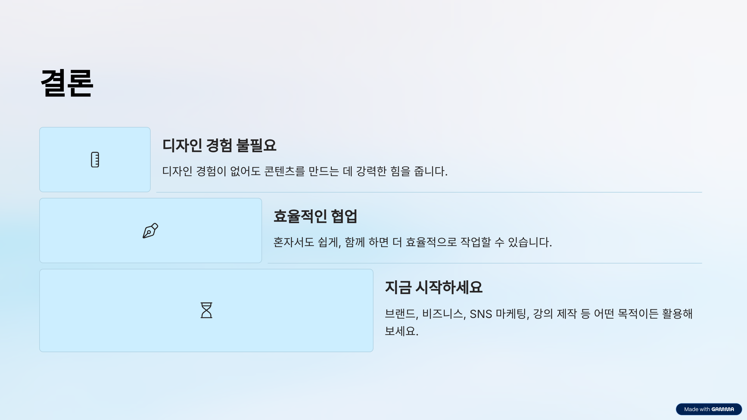 Canva는 디자인 경험이 없어도 콘텐츠를 만드는 데 강력한 힘을 주는 도구입니다.