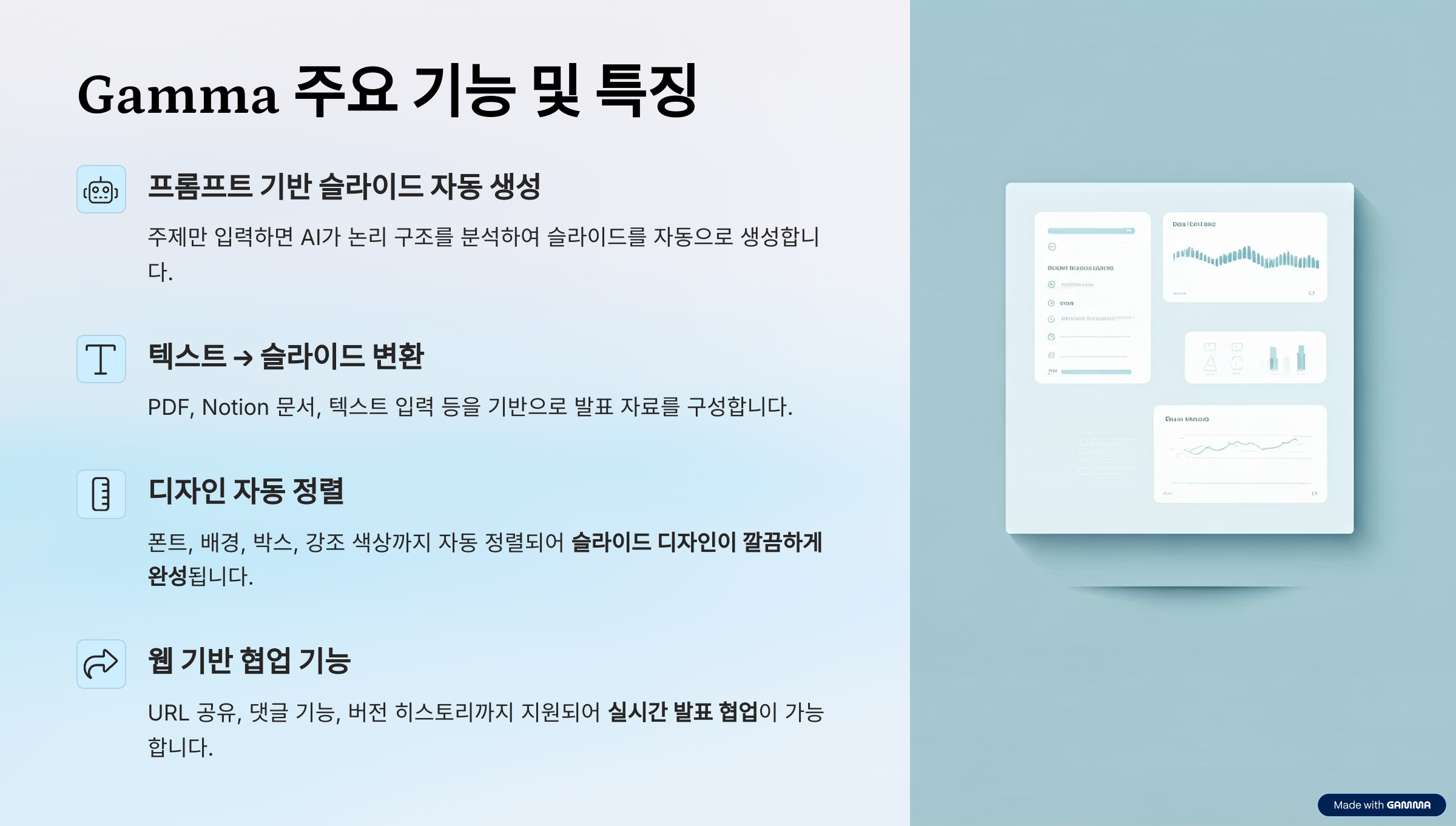 텍스트 입력만으로 완성도 높은 슬라이드를 만들 수 있으며, 협업과 공유까지 간편하게 이루어집니다.
