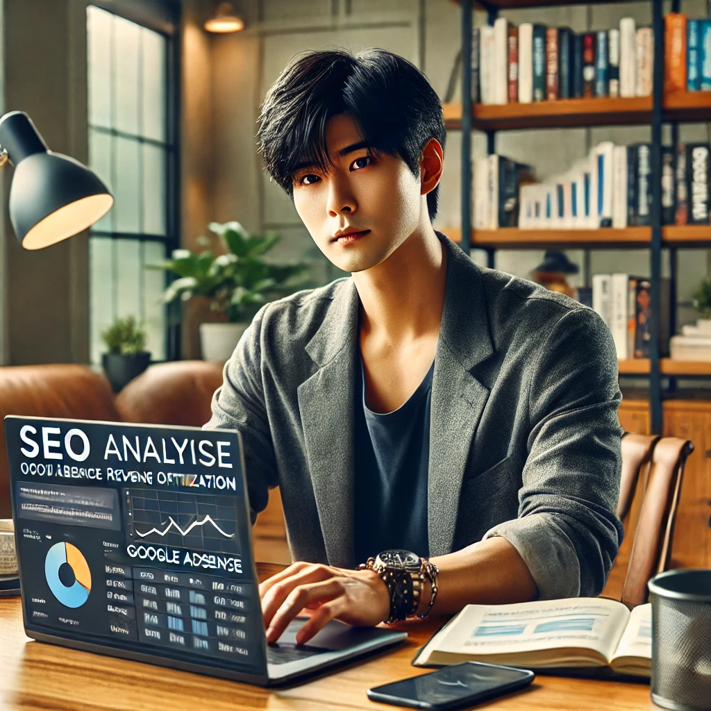 한국인 블로거가 SEO 최적화를 분석하며 애드센스 수익 증가 전략을 계획하는 모습