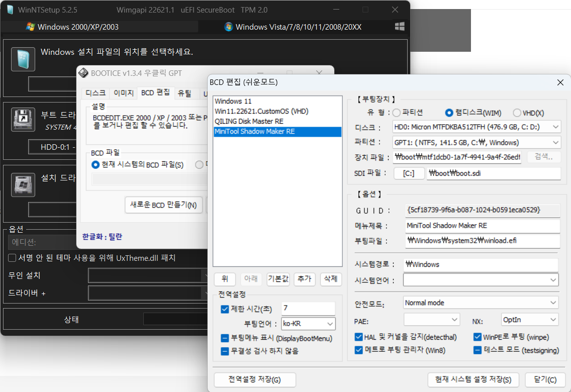 BootIce 로 확인 후 알아보기 쉽게 이름을 변경해 주었습니다. 재부팅해서 확인해 보면 PE 모드인 흑백으로 부팅 메뉴가 뜨는데, 아래의 "메트로 부팅 관리자" 를 체크해 주고 "현재 시스템 설정 저장" 후 "전역설정 저장" 까지 해 주면 익숙한 GUI 형식으로 부트 메뉴가 나옵니다.
