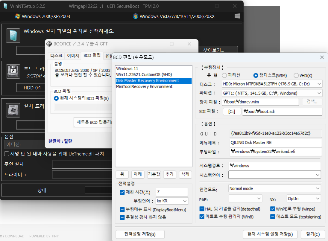 BootIce 로 확인 후 알아보기 쉽게 이름을 변경해 주었습니다. 재부팅해서 확인해 보면 PE 모드인 흑백으로 부팅 메뉴가 뜨는데, 아래의 "메트로 부팅 관리자" 를 체크해 주고 "현재 시스템 설정 저장" 후 "전역설정 저장" 까지 해 주면 익숙한 GUI 형식으로 부트 메뉴가 나옵니다.