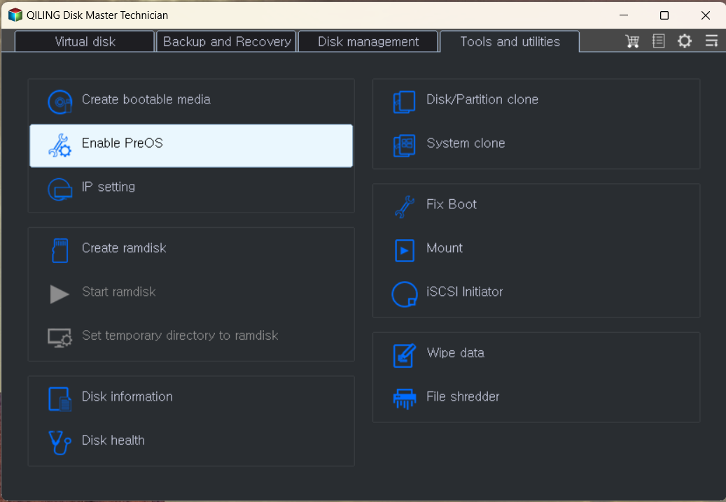 최종적으로 "Tools and utilities" 메뉴에서 "Enable PreOS" 클릭해 주면 자체 부팅메뉴까지 등록됩니다.