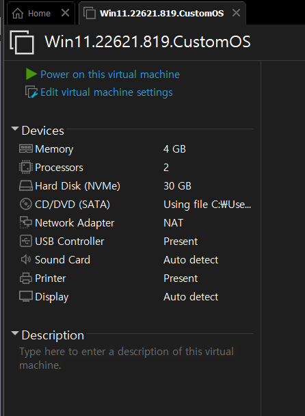 Devices -> Memory->4GB 로 바뀝니다. -> 상단 Power on this virtual machine 클릭하면 VHD 구동 시작.