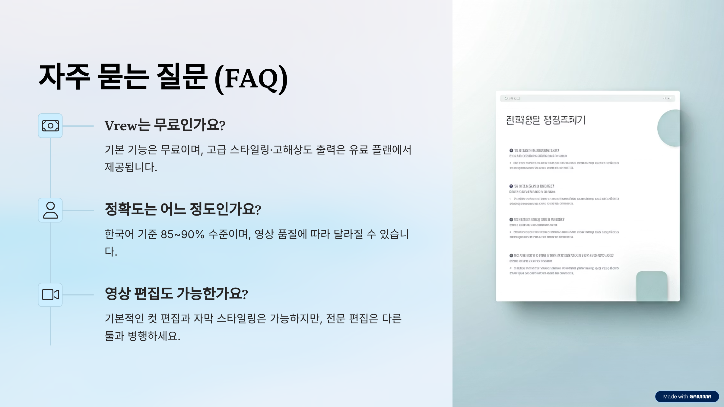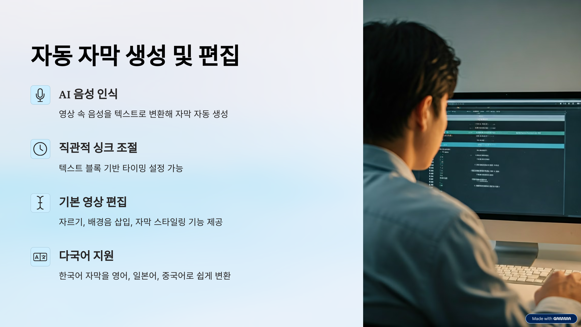 - 강력한 한국어 인식력, 번역 기능, 직관적인 편집 UI로 많은 유튜버와 강사들이 선택하고 있습니다.