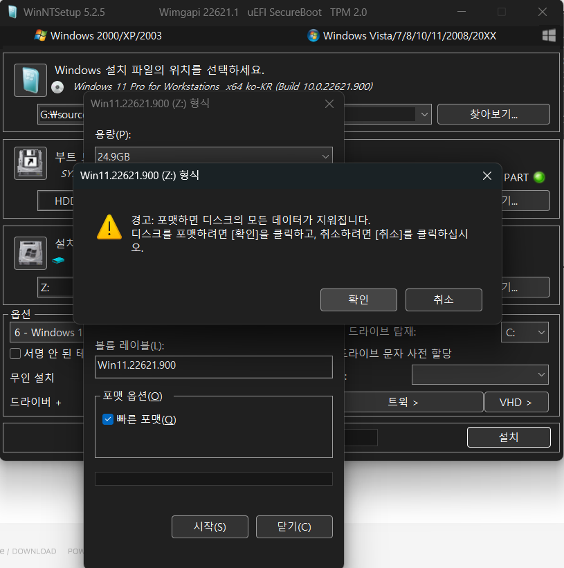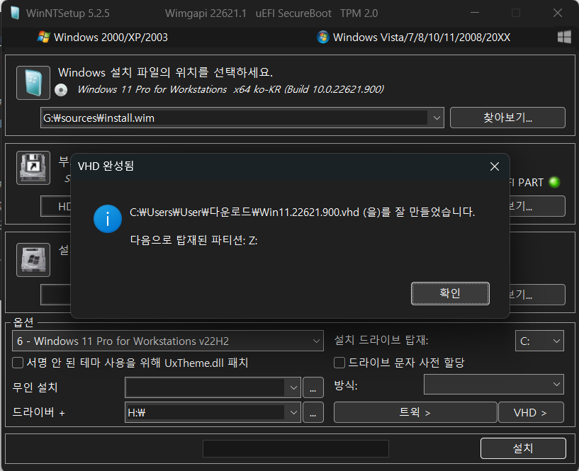 Z(VHD 가상드라이브)에 윈도우 설치용 이미지를 생성해 줍니다. 좌측 하단 "확인" 을 클릭하여 이미지 생성을 진행합니다.