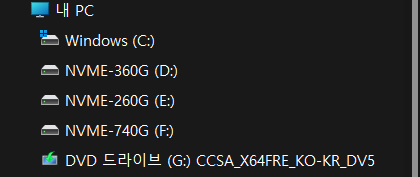 5. ISO 파일을 선택하여 "열기" 해 주면 아래와 같이 가상 드라이브에 마운트 됩니다.