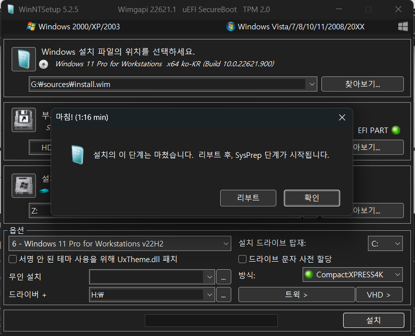 Z(VHD 가상드라이브)에 윈도우 설치용 이미지를 생성해 줍니다. 좌측 하단 "확인" 을 클릭하여 이미지 생성을 진행합니다.