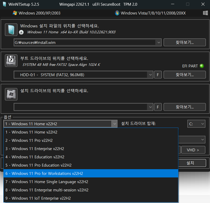 6. 제일 아래 "옵션" 에서 설치할 윈도우 운영체제 종류를 선택해 줍니다.