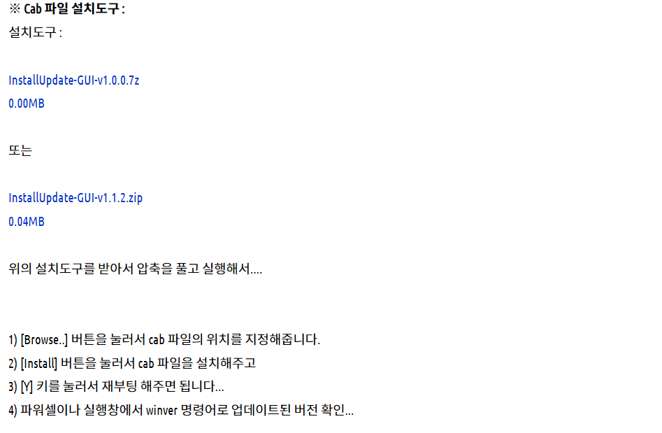 아래는 수동 업데이트 파일 다운로드 링크입니다. 그냥 더블클릭 실행하셔도 되고 오류 발생할 경우 아래 수동업데이트