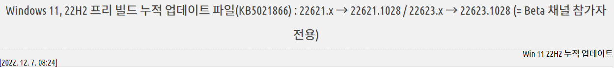 Windows 11, 22H2 프리 빌드 누적 업데이트 파일(KB5021866) : 22621.x → 22621.1028 / 22623.x → 22623.1028 (= Beta