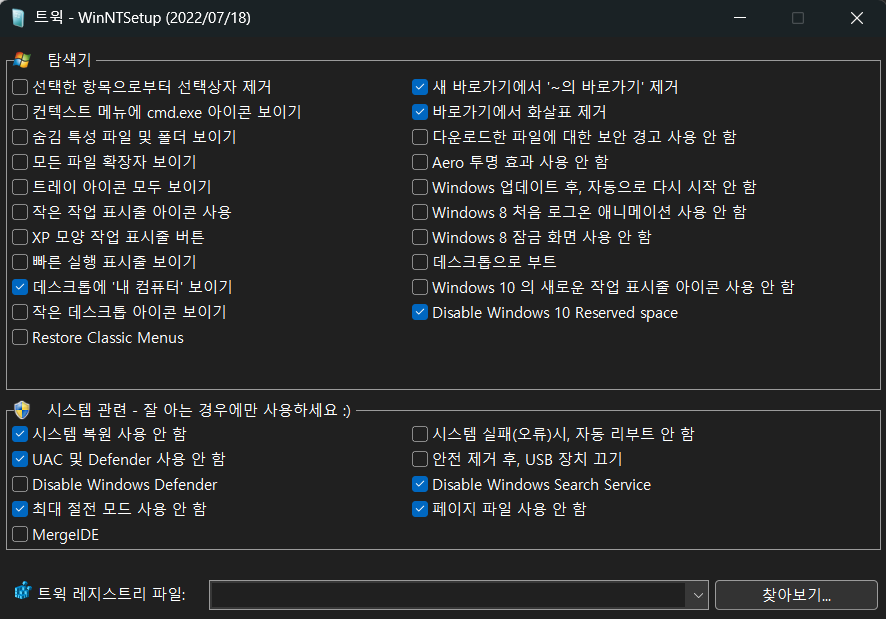 위의 WinNtSetup 트윅에서 "시스템 복원 사용 안 함" 체크시 아래처럼 복구영역이 아예 만들어지지 않습니다.