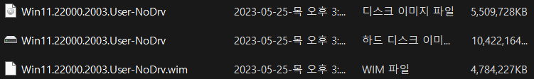 3. Win11.22000.2003.User-NoDrv.ISO 파일은 2번에서 추출한 WIM 파일을 통합하여 적용된 ISO 파일입니다.
