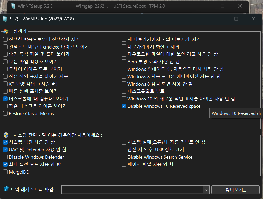 이번 버전의 달라진 점은 자동 설치 옵션인 AutoUnattend.xml 적용하여 사용자 설치과정을 건너뛰었고, WinNtSetup VHD 가상 드라이브 윈도우 설치 옵션에서 아래와 같이 트윅 적용하였습니다.