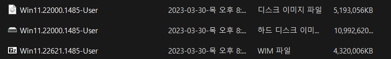 2. Win11.22621.1485-User.WIM 파일은 1번 22621.1485-User.VHD 에서 추출한 WIM 파일입니다.