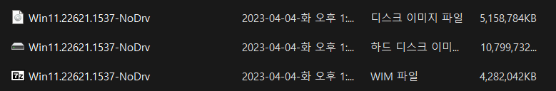 3. Win11.22621.1537-NoDrv.ISO 파일은 2번에서 추출한 WIM 파일을 통합하여 적용된 ISO 파일입니다.