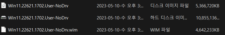 3. Win11.22621.1702.User-NoDrv.ISO 파일은 2번에서 추출한 WIM 파일을 통합하여 적용된 ISO 파일입니다.