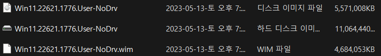 2. Win11.22621.1776.User-NoDrv.WIM 파일은 1번 22621.1776.User-NoDrv.VHD 에서 추출한 WIM 파일입니다.