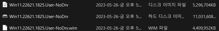 3. Win11.22621.1825.User-NoDrv.ISO 파일은 2번에서 추출한 WIM 파일을 통합하여 적용된 ISO 파일입니다.