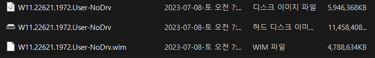 3. Win11.22621.1972.User-NoDrv.ISO 파일은 2번에서 추출한 WIM 파일을 통합하여 적용된 ISO 파일입니다.
