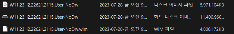 3. Win11.22621.2115.User-NoDrv.ISO 파일은 2번에서 추출한 WIM 파일을 통합하여 적용된 ISO 파일입니다.