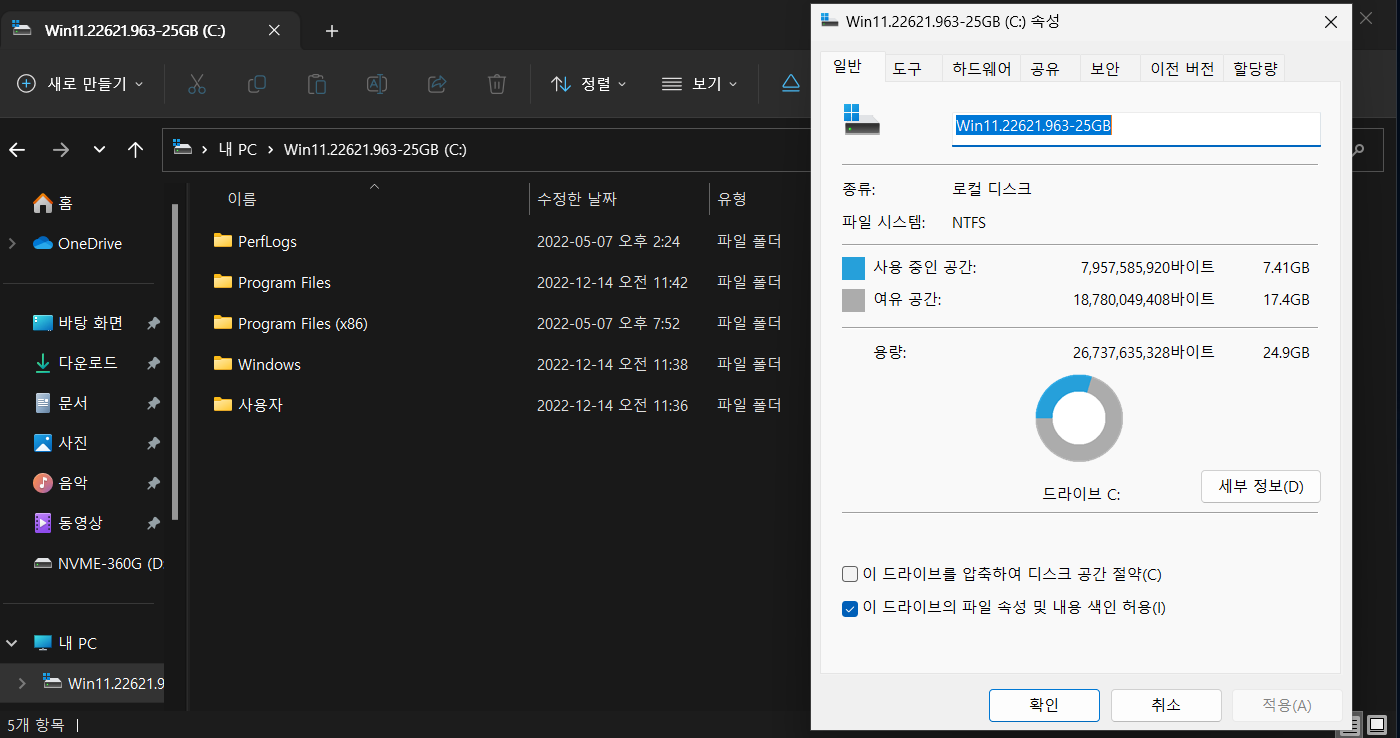 3. Win11.22621.963-25GB.ISO 파일은 2번에서 추출한 WIM 파일을 통합하여 적용된 ISO 파일입니다.