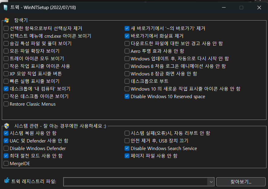 위의 WinNtSetup 트윅에서 "시스템 복원 사용 안 함" 체크시 아래처럼 복구영역이 아예 만들어지지 않습니다.