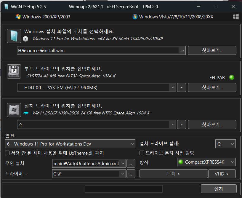 3. Win11.25267.1000-25GB-Admin.ISO 파일은 2번에서 추출한 WIM 파일을 통합하여 적용된 ISO 파일입니다.