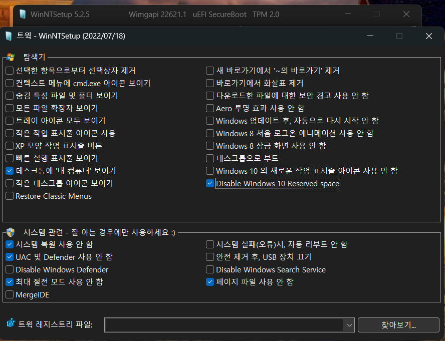 사용자 이름은 "Administrator" 로 입력되어 있고, 관리자권한으로 설치되어 있습니다. 이번 버전의 파티션 구성은 GPT/UEFI 버전이며, VHD 동적할당 25GB로 만들었습니다.제가 작업하여 배포하는 버전의 기본 베이스는 아래 "홍차" 님 블로그에 올라온 자료를 기본으로 작업합니다.